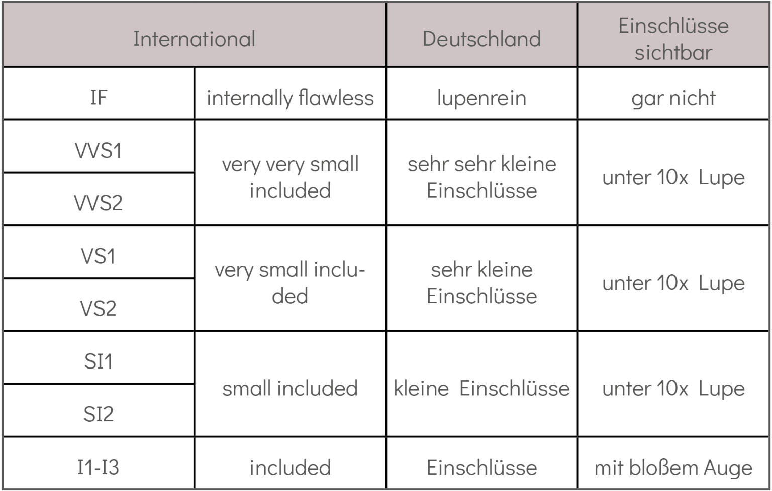 - Clarity (Reinheit): Die Reinheit bezieht sich auf Unreinheiten und Einschlüsse im Diamanten. Ein makelloser Diamant ist selten und entsprechend wertvoll. (z.B. SI1)