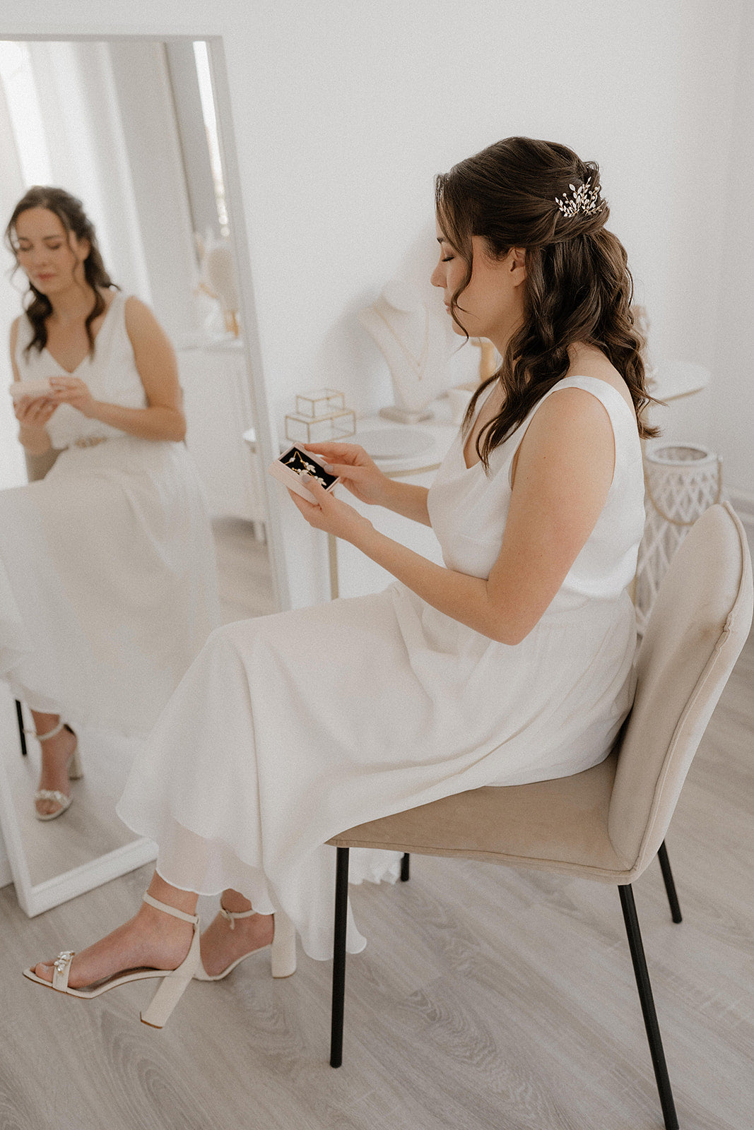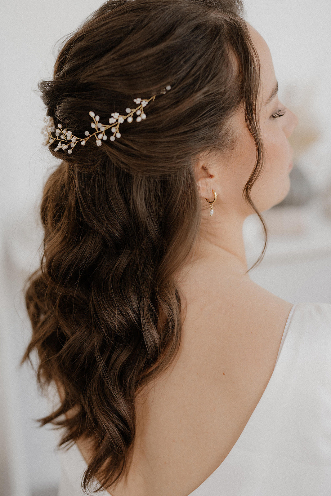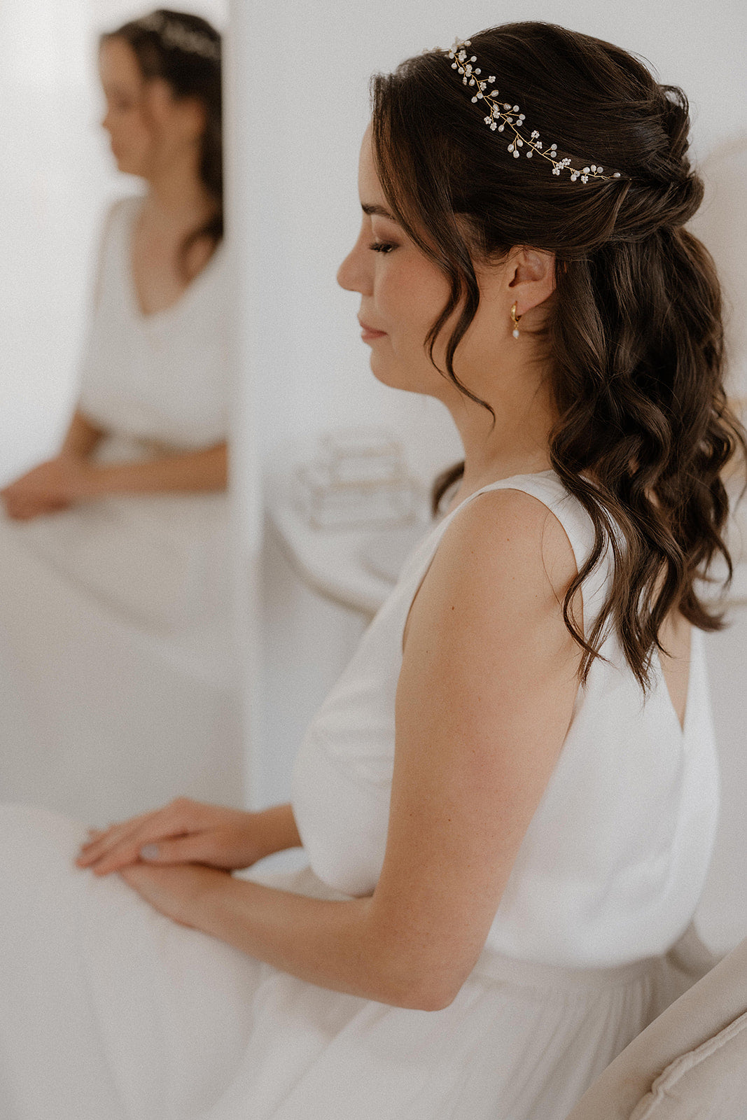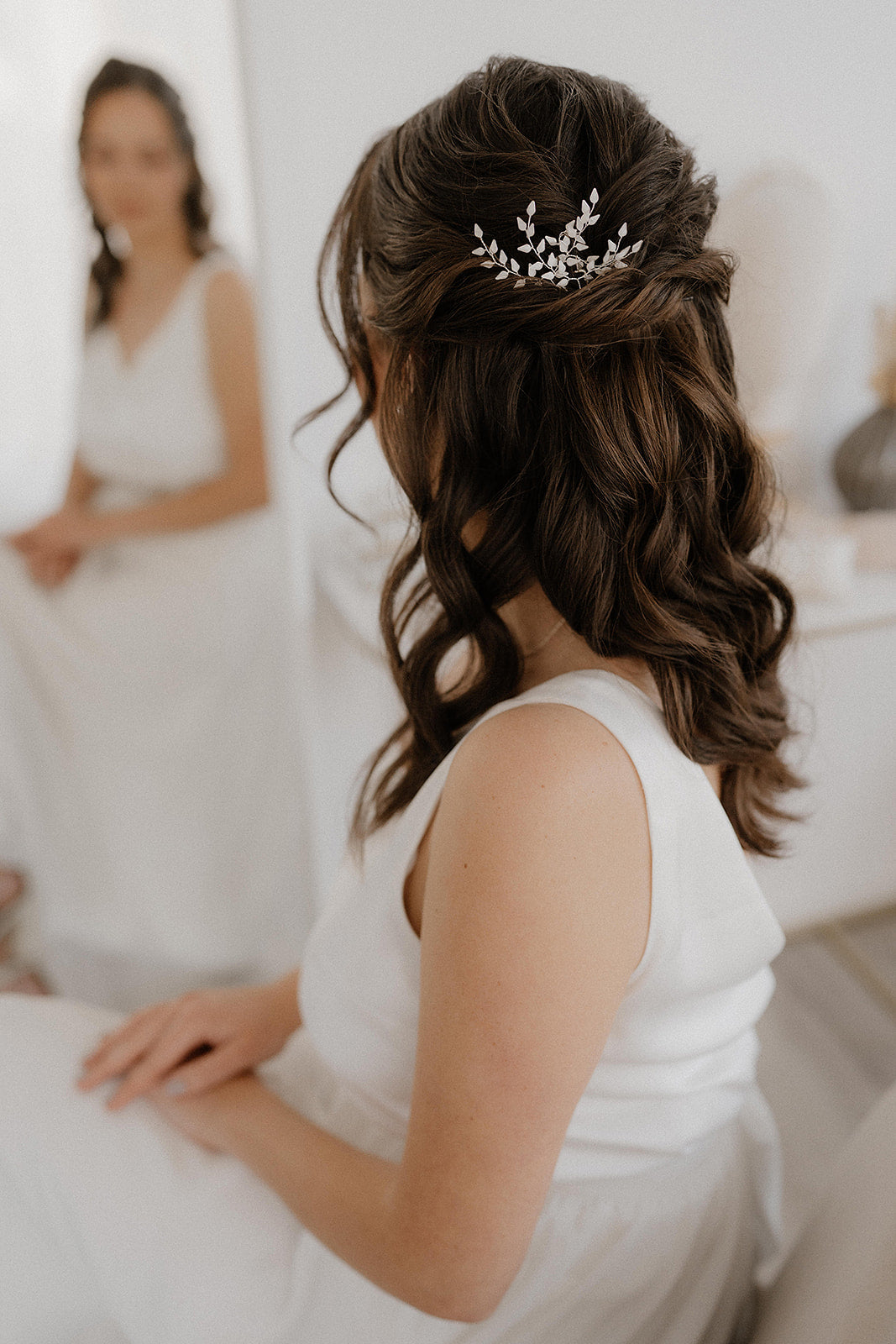 Auf den Bildern trägt Sarah ihr Haar als locker gesteckten Half Updo, also als halbe Hochsteckfrisur, die je nach verwendetem Haarschmuck ganz unterschiedlich gestaltet werden kann. Diese Frisur ist aktuell bei vielen Bräuten sehr beliebt und unterstreicht einen eleganten, stilbewussten Brautlook.