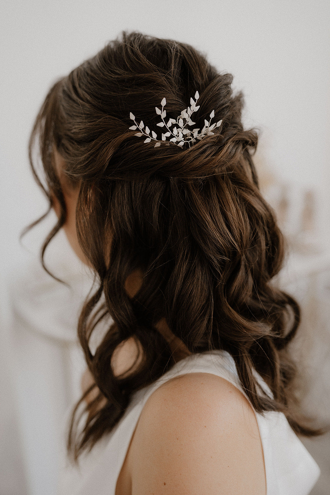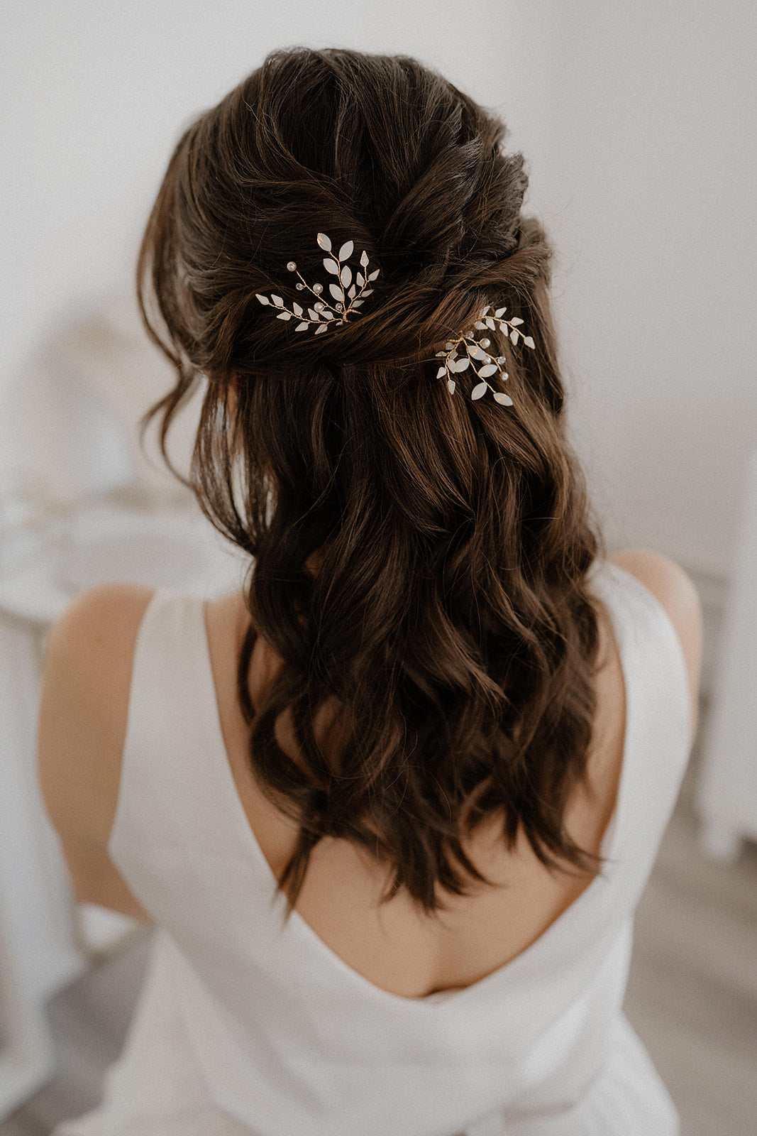 Auch mit unseren Haarnadeln lässt sich Deine Brautfrisur ganz individuell gestalten. Durch die Flexibilität der Ästchen der Haarnadelsets Gretchen und Lana, die jeweils aus zwei bzw. drei Haarnadeln bestehen, bieten sie viele Stylingmöglichkeiten und lassen sich in jede Arten von Brautfrisur einarbeiten. Die Haarnadeln können entweder zusammen gesteckt oder auch an verschiedenen Stellen in Deine Frisur eingearbeitet werden.