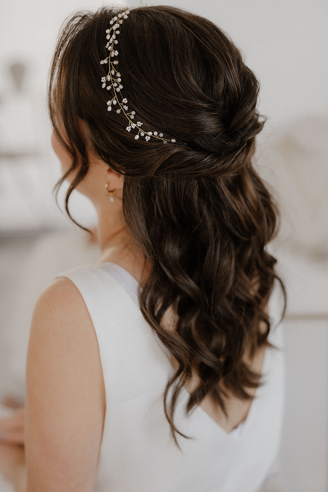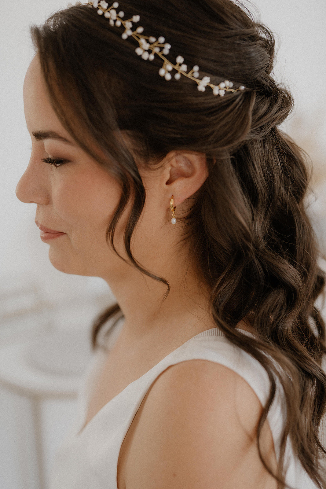 Das flexible Haarband Susi bietet viele Stylingmöglichkeiten und lässt sich in jede Art von Brautfrisur integrieren. Ob offenes, halboffenes Haar oder Dutt – trage Susi auf Deine persönliche Art. Das Haarband kann mit kleinen Haarnadeln befestigt oder mit einem Band geschlossen werden. Auf den Bildern siehst Du wie unterschiedlich Susi wirken kann, je nachdem ob das Haarband am Vorder- oder Hinterkopf befestigt wird.