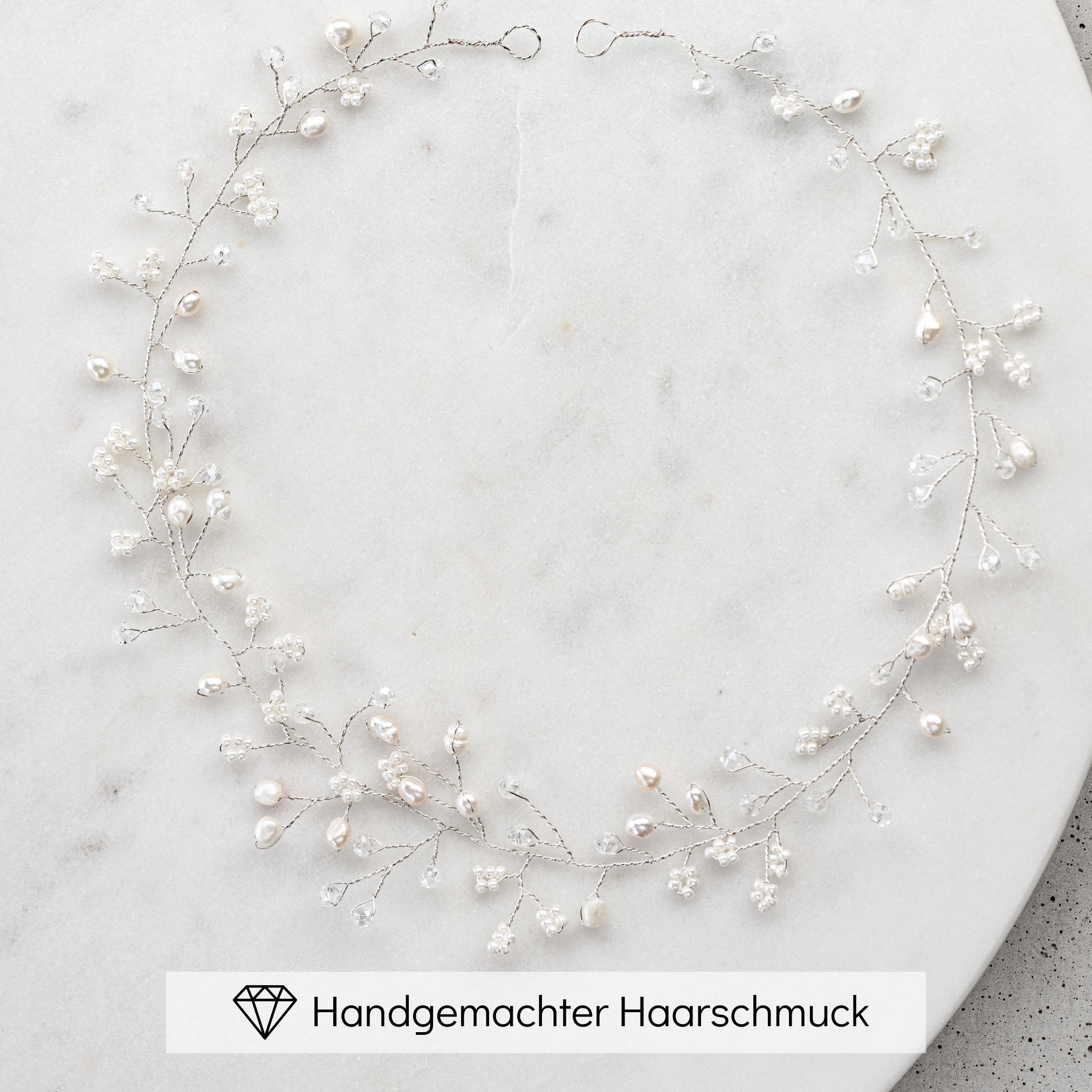 Unsere Kollektion umfasst hochwertigen Haarschmuck in Silber für die Braut, der nicht nur wunderschön aussieht, sondern auch funktional durchdacht ist: Die feinen, flexiblen Ärmchen, an denen Perlen und Elemente befestigt sind, lassen sich individuell biegen. So kann der silberner Haarschmuck an der Hochzeit mühelos in jede Frisur eingearbeitet werden – ganz gleich, ob Du eine romantische Hochsteckfrisur, sanfte Wellen oder eine moderne Flechtfrisur trägst. Unser Haarschmuck in Silber passt sich jedem Look an und sorgt für sicheren Halt – den ganzen Tag.