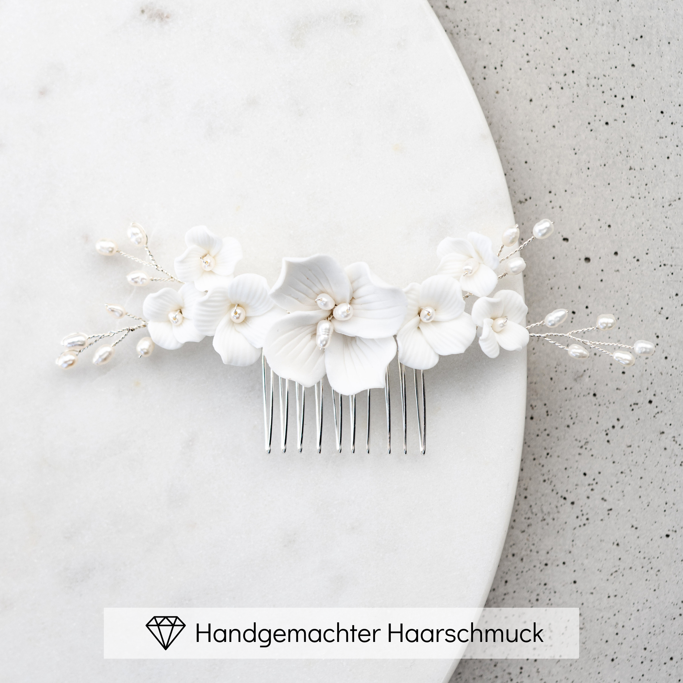 BestsellerCoco | Brauthaarschmuck - Haarkamm mit weißen Blüten und echten Perlen
