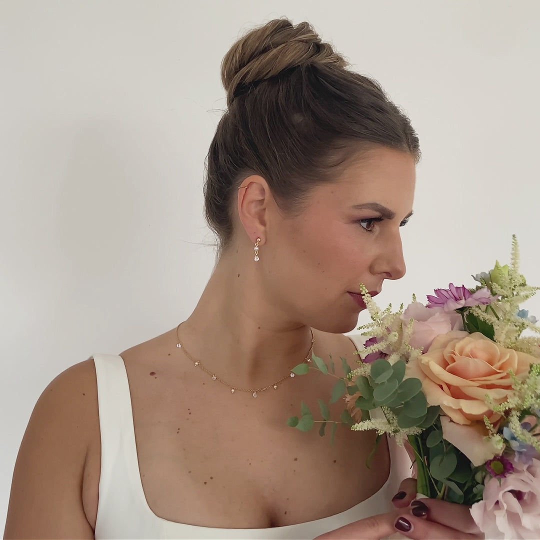 Planst du Deine Hochzeit und suchst nach dem perfekten Brautschmuck? Entdecke wunderschöne und handgemachte Brautohrringe, Hochzeithalsketten, Brautarmbänder, und Brautschmuck Sets. Du findest bei uns Ohrringe für die Hochzeit in Gold, Silber und Rosegold, die dein Hochzeitsoutfit perfekt ergänzen. Unsere hängenden Ohrringe für die Braut in Gold oder Silber lassen dich strahlen. Kombiniere deine Brautohrringe mit einer passenden Kette für die Hochzeit oder einer funkelnden Hochzeitshalskette, die dein Dekolleté betont. Mit einem stilvollen Brautschmuck Set ziehst du alle Blicke auf dich. Mit unserem nachhaltigen Brautschmuck unterstreichst du Deinen Look und deine Hochzeit wird unvergesslich!
